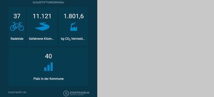 31 Radelnde des Teams SchulSTIFTUNGSRADler legten in drei Wochen ca. 11.500 km mit dem Fahrrad zurück und belegten Platz 35 von 418 Teams der Stadt Freiburg. Das Team der Schulstiftung sparte damit ca. 1,8 Tonnen Kohlendioxid ein.